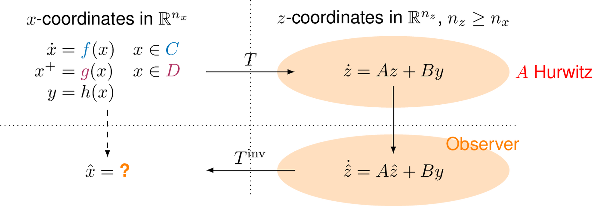 La troisième partie explore la conception d’observateurs pour les systèmes hybrides avec des temps de saut inconnus. En supposant que la sortie soit identique avant et après les sauts (ce qui rend les sauts indétectables), nous proposons une approche systématique basée sur KKL, transformant le système hybride en un filtre stable en temps continu de la sortie, construisant un observateur en temps continu, et récupérant l’estimation en inversant cette transformation, sans avoir à détecter les instants de saut. Nous fournissons des conditions suffisantes pour que cette transformation soit bien définie et injective en dehors de l’ensemble de saut, permettant la construction de son inverse à gauche pour l’utiliser dans l’observateur. La convergence asymptotique en dehors des temps de saut, avec une robustesse face aux incertitudes, est alors démontrée, dans une métrique non euclidienne prenant en compte l’indistinguabilité des états avant et après les sauts. Comme application, nous étudions l’estimation de la force de friction dans le phénomène de stick-slip, fréquent dans le forage pétrolier. Dans ce cas, la transformation inverse est approximée à l’aide d’un réseau de neurones entraîné sur des données de simulations hors ligne.