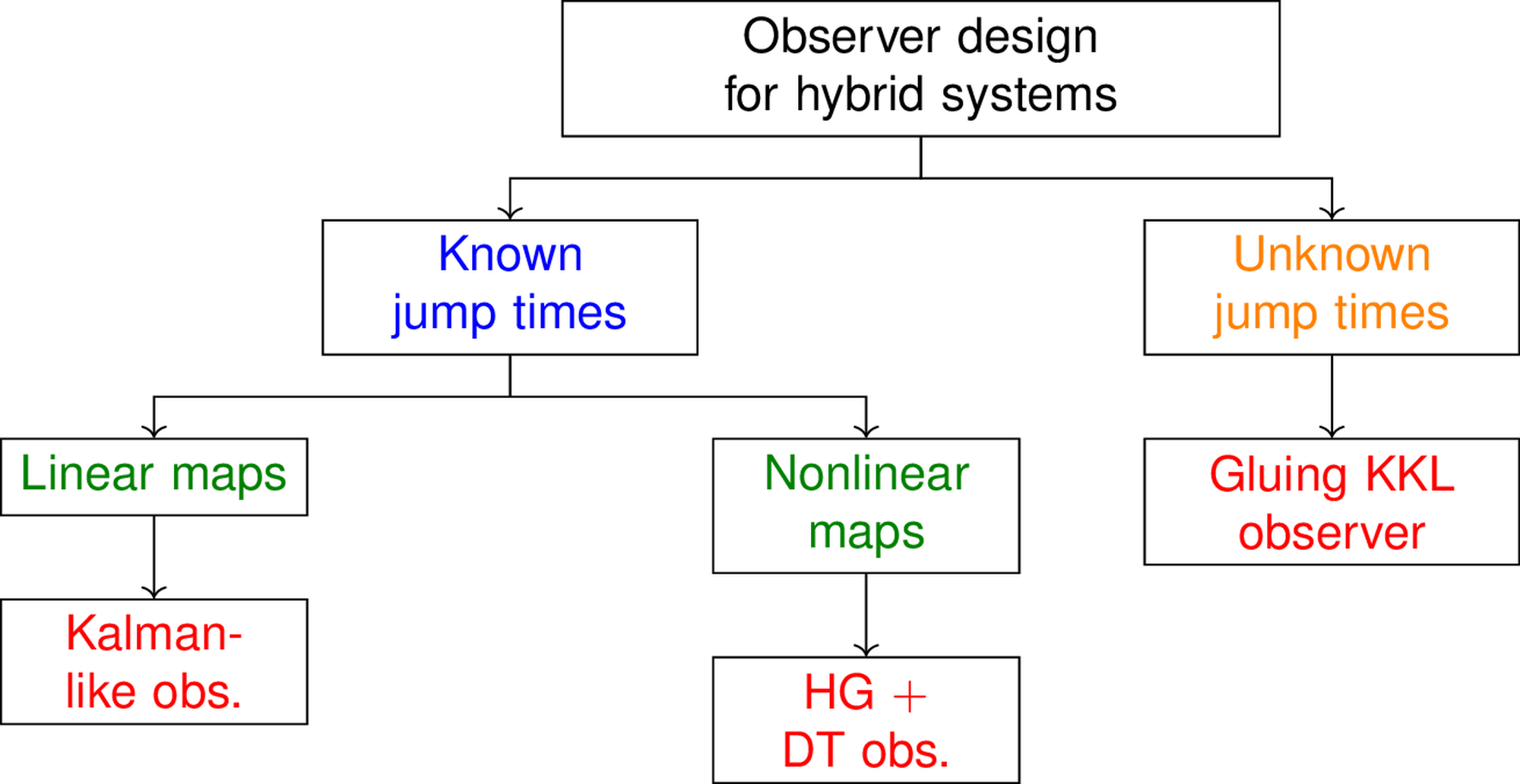 To address Challenge \( \mathbf{1}\) and Challenge \( \mathbf{2}\) with hybrid systems, our strategy as illustrated in Figure 8 is to consider two main cases: when the jump times of the system’s solutions, i.e., the times at which discontinuous jumps occur, are known and when they are not. For a broad class of hybrid systems including mechanical systems with impacts such as [31], the solution’s jump times can be inferred from the system’s measured output (e.g., in a bouncing ball as in Example 1 when the measured ball position is at the ground) or detected thanks to sensors. For some other classes of hybrid systems, such as mechanical systems exhibiting stick-slip (see Section 4.3), the detection of solutions’ jump times is challenging, thus classifying them into the second main case of unknown jump times.