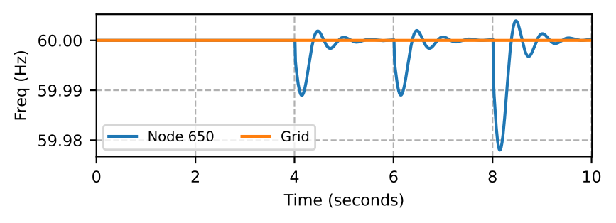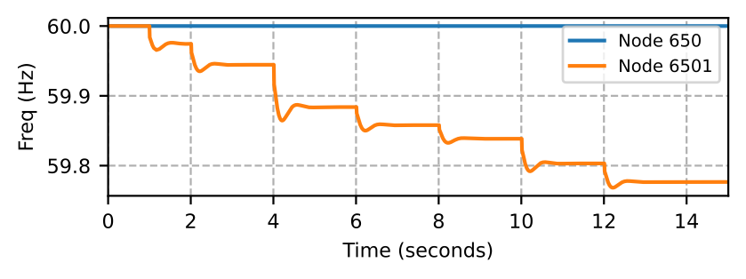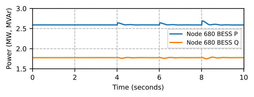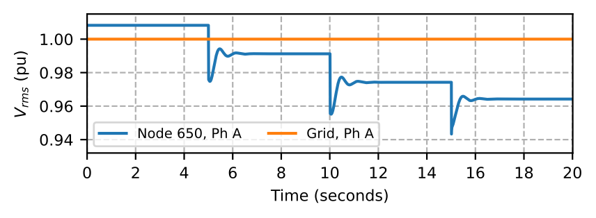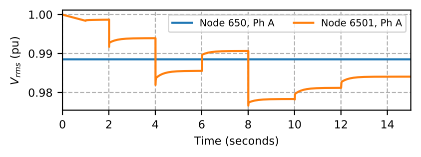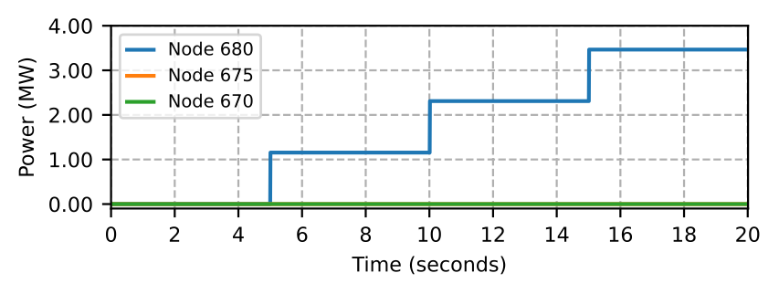 To adapt this scenario to the test system discussed in this paper, we assume aggregated single-phase residential loads with V2G capability. To simulate this case, we configure the test system in Fig. 1 to connect the MBB-based microgrid (MG0) to the grid via BTB converter. We open switches between nodes 632 and 633 and nodes 671 and 692 in MG0, and disconnect load at node 670. Thus, we have V2G responses from three nodes, i.e., 680, 645, and 646. The loads at nodes 645 and 646 are constant power phase B loads, while the load at node 680 is a three-phase constant power load.