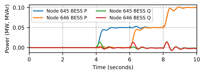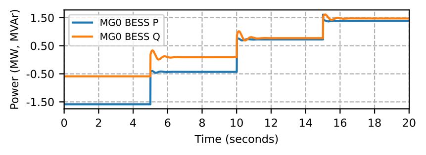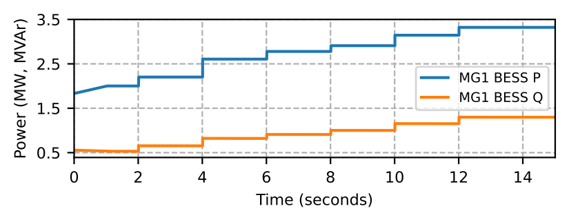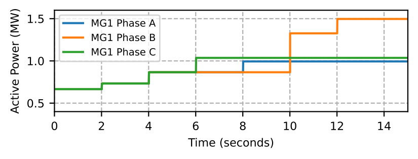 Fig. 3 shows the aggregated phase-wise loads in MG1. We start the simulation with three-phase loads at nodes 6751 and 6801 served in MG1 with its BESS. The microgrid MG0 is operating at its rated load (data center loads and other loads) with power supplied from DG, PV, and BESS. In MG1, at \( t=2\) and \( t=4\) seconds, we bring three-phase loads at nodes 6701 and 6341 online, respectively.