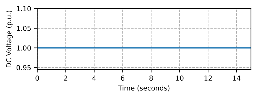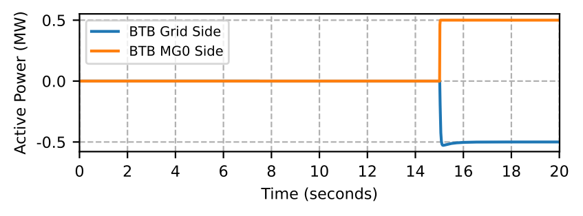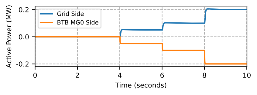 The MBB is modeled using a BTB converter with additional controls and communication blocks and is located at the Point of Common Coupling (PCC) of MG0. We use the phasor domain model of the BTB converter, detailed in [14] for this study. The BTB converter has two AC/DC converters connected together by a DC-link. Both of the AC/DC converters in the BTB converter are rated as 3.5 MVA with the nominal DC-link voltage set to 8000 V. Among these two converters, one is responsible for regulating the DC-link voltage of the BTB converter (AC/DC Converter 1 at MG0-side), while the other is responsible for controlling the power flowing through the BTB converter (AC/DC Converter 2 at MG1-side). The DC-link is a implement as a capacitor and its dynamics are modeled as shown in the results corresponding to the DC-link voltage (vertical axis labeled as DC Voltage in figures). The AC/DC Converter 1 is modeled as a grid-following current source converter and the AC/DC Converter 2 can operate in either grid-forming or grid-following mode. The model captures the charging and discharging dynamics of the DC-link, which is an important aspect of the BTB converter model [14].
