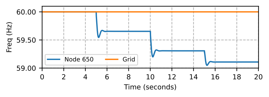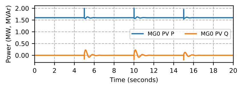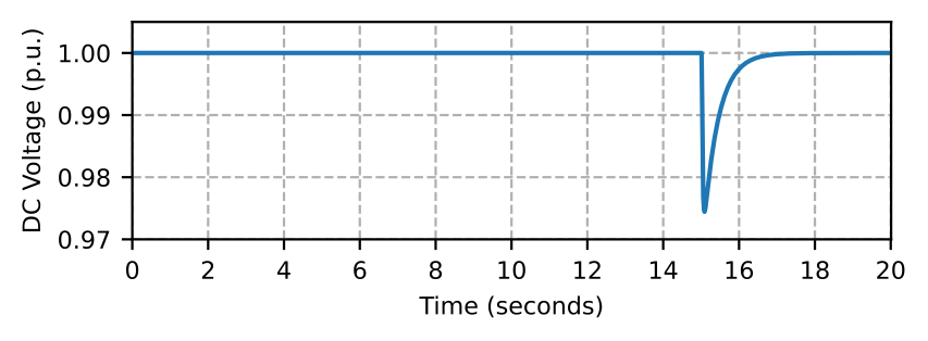We simulate a situation with a rapid increase in EV charging demand as customers prepare to evacuate an area. As Fig. 19 shows, EV charging load at node 680 is zero till \( t=5\) seconds. At \( t=5\) seconds, EV charging load increases to 1155 kW, which is equivalent to 23 EVs charging at 50 kW high-power DC chargers. At \( t=10\) seconds, we double the charging demand. Similarly, at \( t=15\) seconds, the EV charging demand becomes 3465 kW, equivalent to 70 EVs charging at the DC chargers. During this emergency situation, MG0 fully supplies the EV charging load on its own till \( t=15\) seconds. However, MG0 generation becomes insufficient at \( t=15\) seconds, and hence, draws power from the grid via BTB converter as shown in Fig. 20. The DC-link voltage of the BTB converter during this power transfer is regulated back to 1 per unit by the BTB controller as shown in Fig. 21. Fig. 22 shows the BESS power which is charging before \( t=5\) seconds from the PV power in Fig. 23, and supplies the EV charging power after \( t=5\) seconds due to the increased load demand in the microgrid. During this emergency situation, frequency at MG0 falls to 59.1 Hz, while the grid frequency remains at 60 Hz as shown in Fig. 24. Similarly, phase A voltage measured at node 650 terminal, which is also the voltage at the MG0 terminal falls to 0.946 per unit, which is significantly lower than the phase A grid voltage as shown in Fig. 25. We show only phase A voltage at MG0 and grid because all phase voltages are almost balanced in this simulation. These frequency and voltage profiles at MG0 show the capability of the BTB converter to allow the MBB-based microgrid to remain connected to the grid and exchange power during emergencies irrespective of the power quality at MG0 and grid during emergencies.