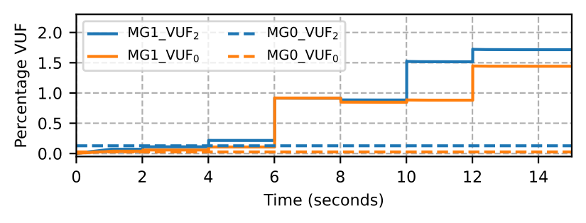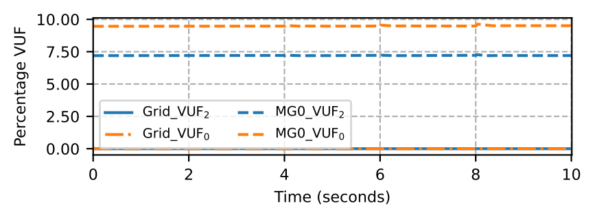To show a high unbalance scenario, we disconnect the two microgrids from the grid to create a set of networked microgrids. The simulated experiment involves increasing the voltage unbalance in the neighboring microgrid, MG1, to study the impact on performance of the MBB based microgrid, MG0, and evaluate the MBB-based solution to isolate the voltage unbalances. The voltage unbalance is simulated by turning on unbalanced loads in the neighboring microgrid, MG1. Here, we define Voltage Unbalance Factor (VUF) based on negative and zero sequence components as: