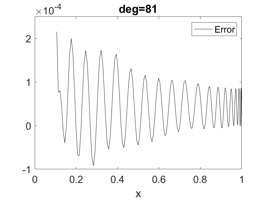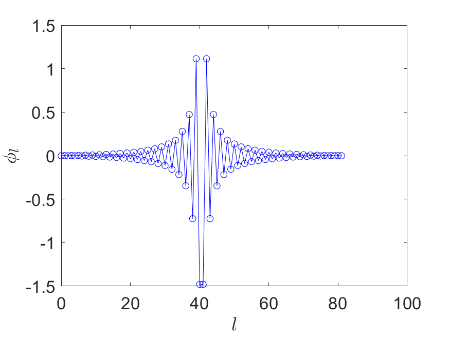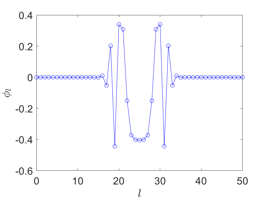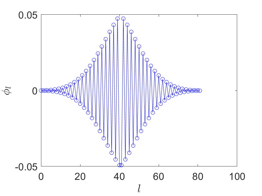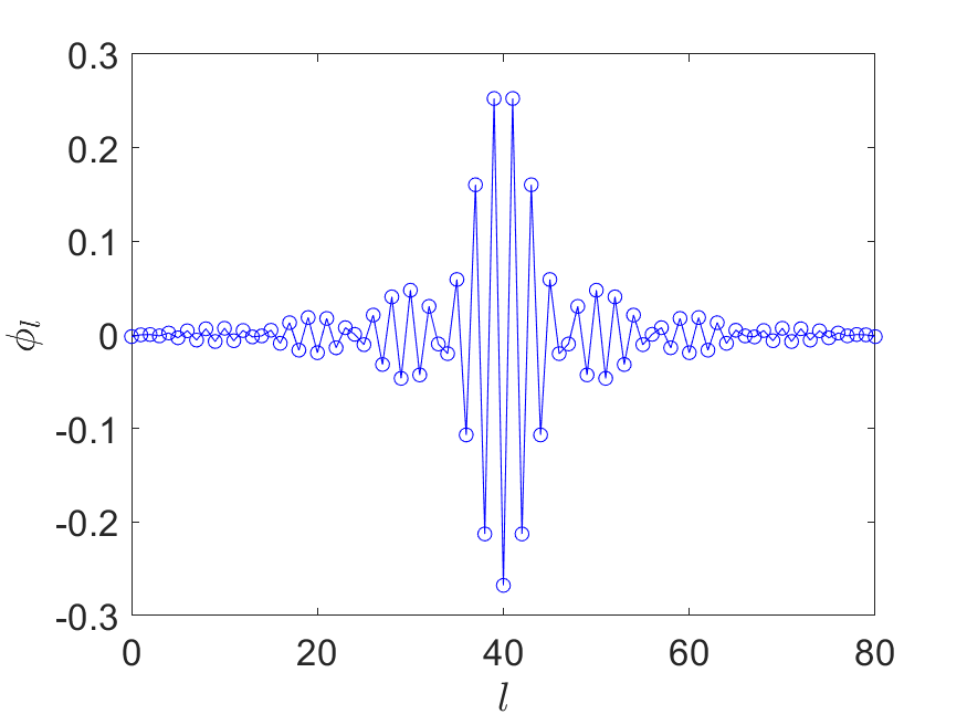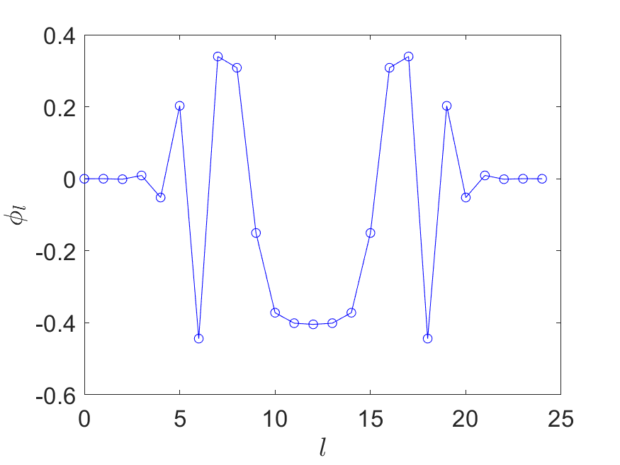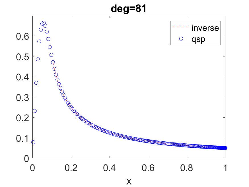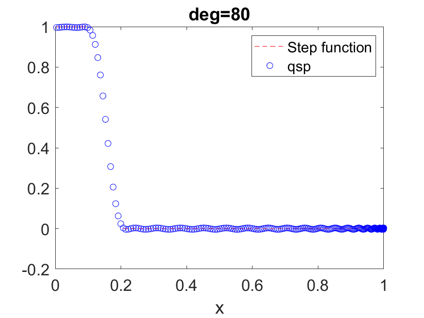 We can achieve this by approximating the sign function, with \( \deg(P_{\operatorname{Re}})=\mathcal{O}(\log(1/\epsilon^2) a^{-1})=\mathcal{O}(\log(1/\epsilon)\sqrt{N})\) (see e.g. [29, Corollary 6]). This construction is also based on an approximation to the \( \mathrm{erf}\) function. (40) gives a concrete construction of an odd polynomial obtained via numerical optimization, and the phase factors are obtained via QSPPACK.