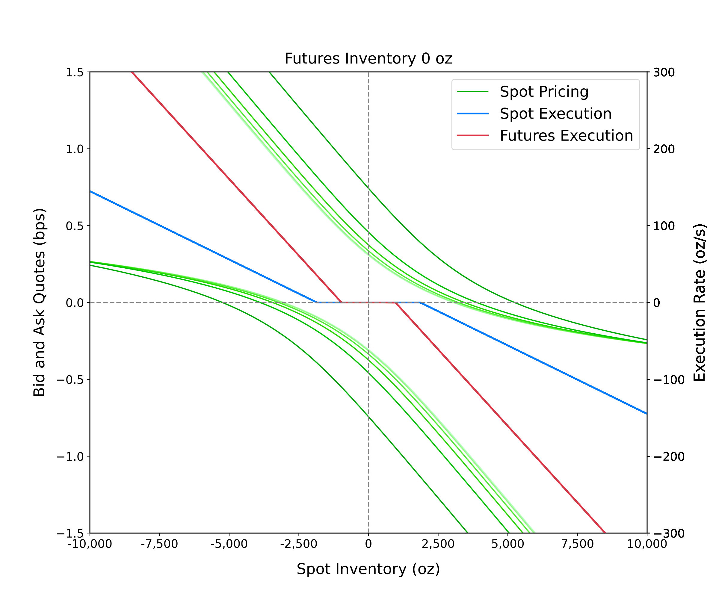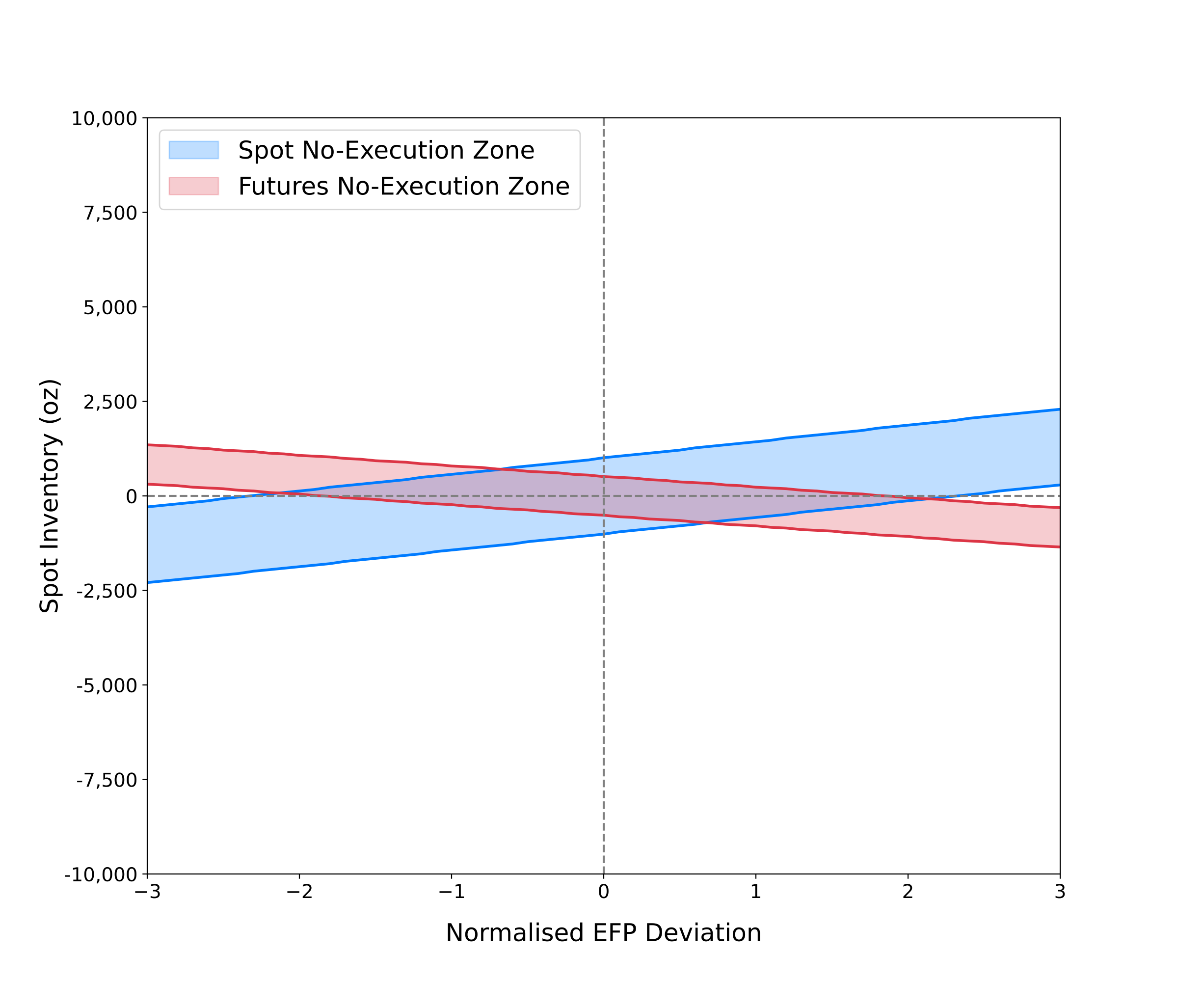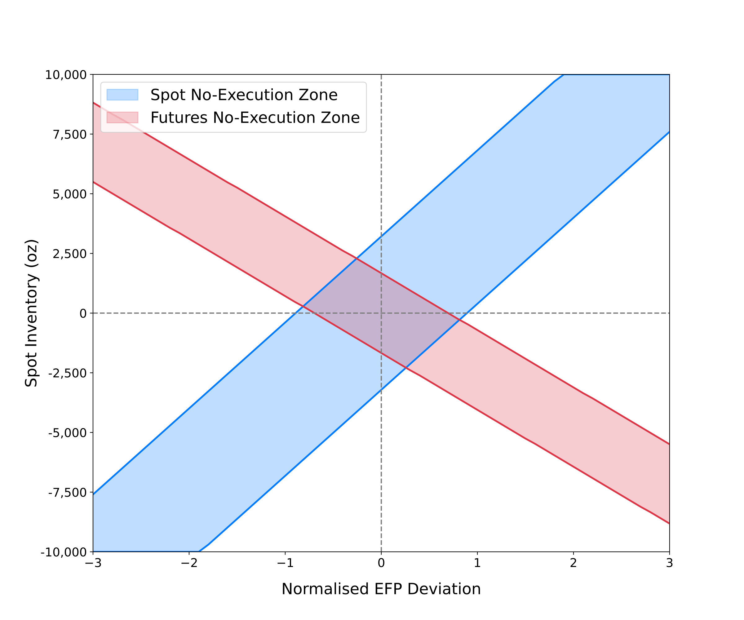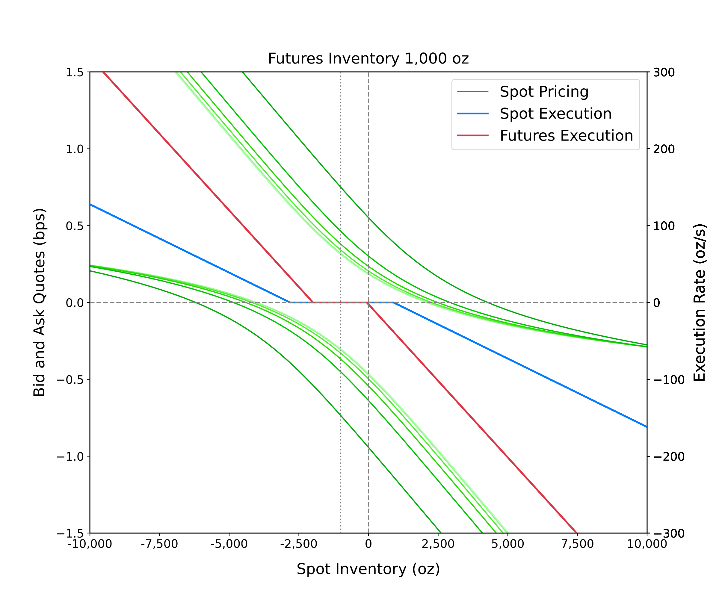 Diverging from conventional approaches that focus solely on correlated asset price dynamics, our model capitalizes on the unique benefits of using co-integrated assets for hedging, regardless of whether the market maker proposes quotes in those assets. Co-integration offers indeed a special opportunity for market makers to tap into enhanced liquidity pools and benefit from mean reversion. This is particularly relevant in the case of a spot dealer hedging their position through futures, as in the case of precious metals market. While the interbank spot market does exist, precious metals futures are considerably more liquid, with tighter spreads and higher volumes. Since the price difference between futures and spot – so-called Exchange for Physical (EFP) spread – is primarily driven by swap rates which are relatively stable over the market maker’s intraday risk horizon, the co-integration assumption between spot and futures prices is very natural.