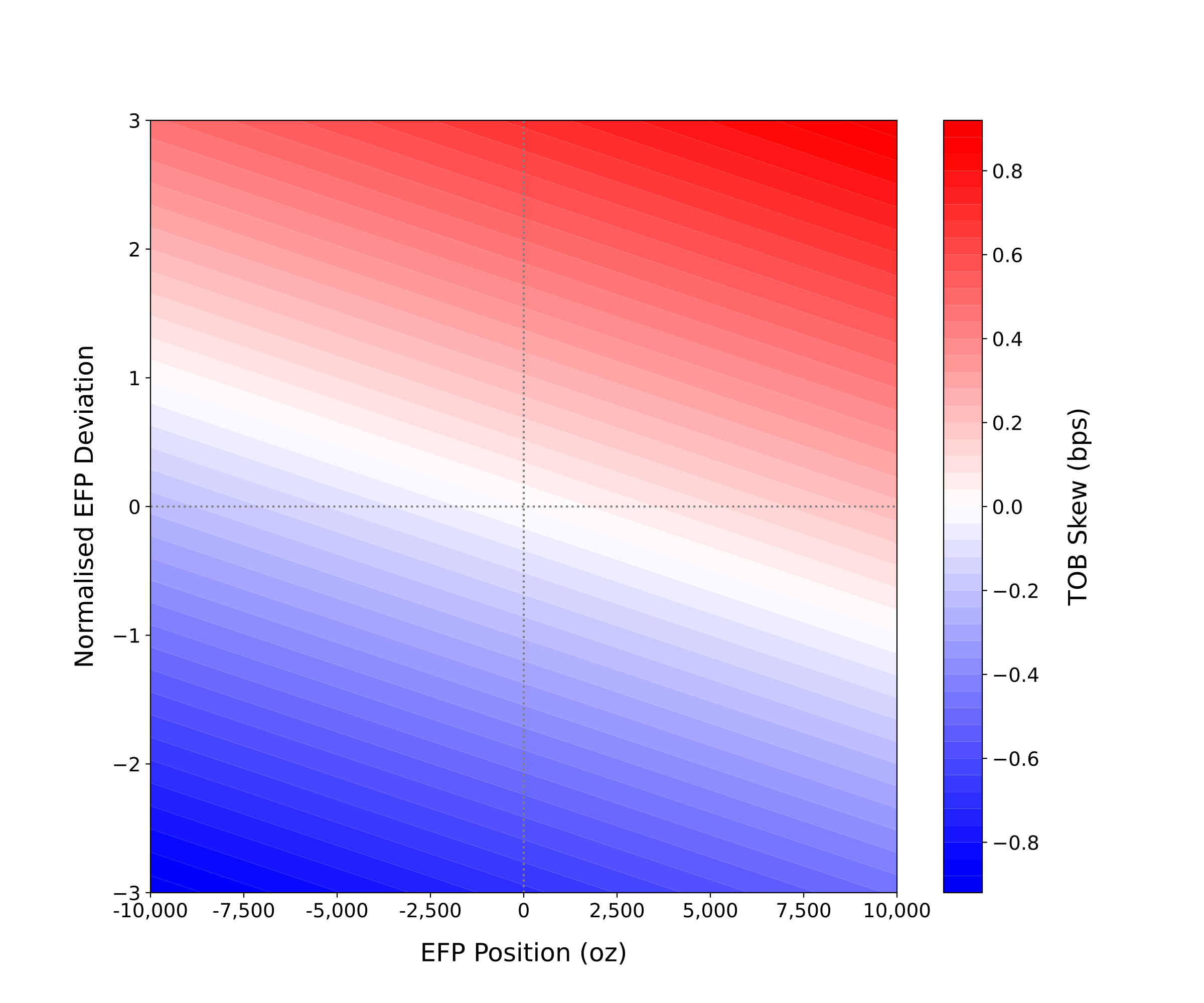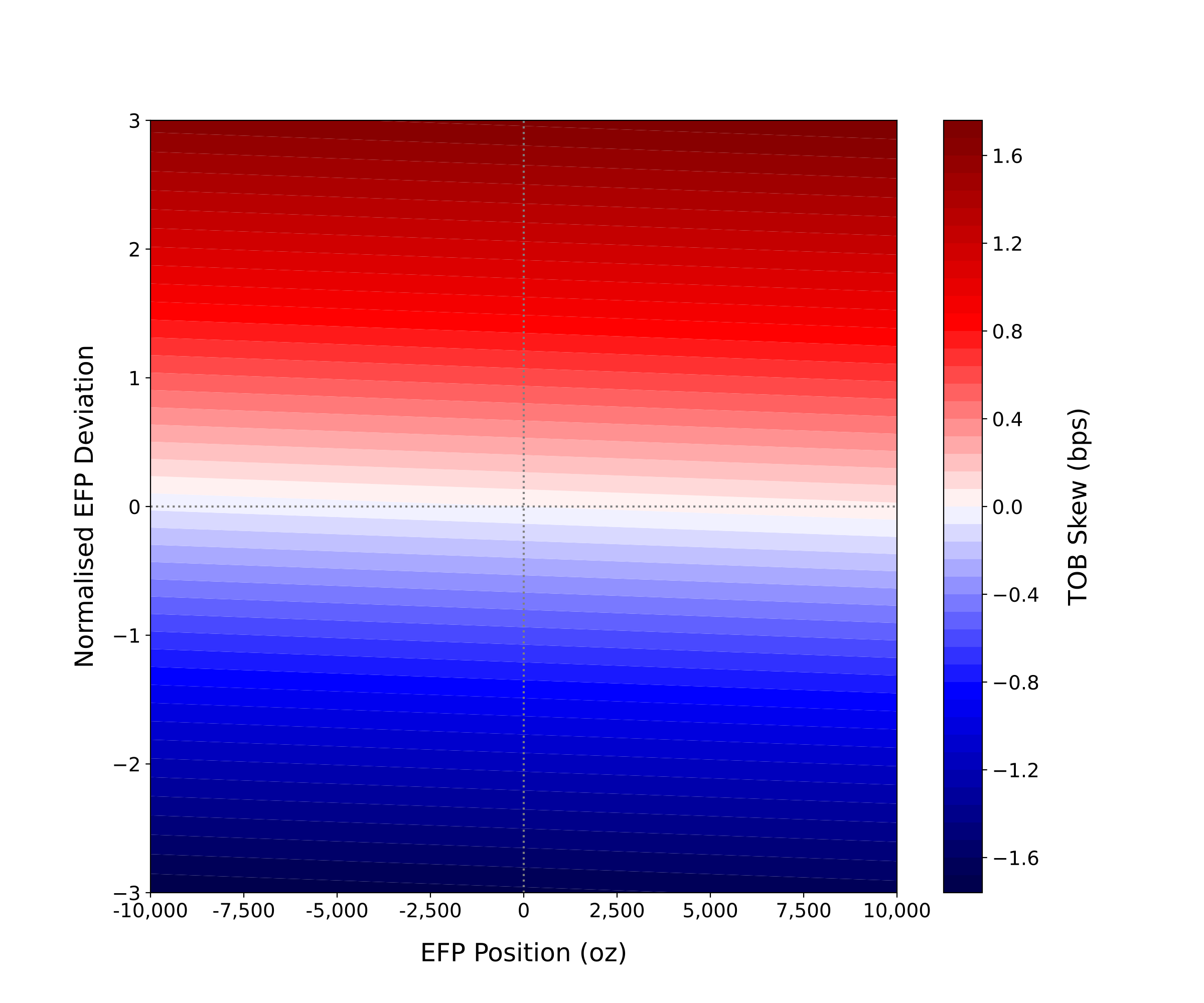 EFP mean reversion influences optimal controls. EFP deviation from the expected mean shifts the equilibrium inventory along with the corresponding execution onsets and quote skew, as shown in Figures 5 and 6. Understandably, when the deviation is negative the dealer will tend to accumulate long EFP position, and vice versa. Figure 5 demonstrates that EFP mean reversion will only lead to rare direct arbitrage opportunities under strong risk aversion. This is related to the cost of opportunistically entering into an EFP position (one would have to cross two spreads). The dealer will instead skew quotes in the required direction (see Figure 6) and wait for the opportunity to materialize while making spread. With a lower risk aversion, the appetite to capitalize on EFP mean reversion increases leading to opportunistic execution at extreme deviations (where the upper futures execution onset is below the lower spot execution onset and, similarly, where the lower futures execution onset is above the upper spot execution onset). The skew will be repurposed from EFP risk management to opportunistic skew on EFP deviation, as shown in Figure 6.