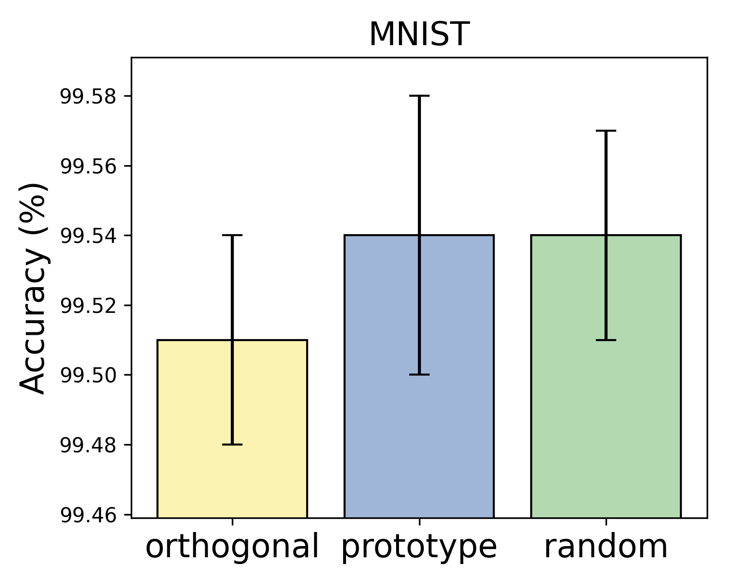 The class embedding matrix \( W_{\mathrm{Embed}}\) can be either fixed or jointly learned with the model. In the fixed case, we set \( W_{\mathrm{Embed}}\) to be the identity matrix, where each class embedding is a one-hot vector. In the learned case, \( W_{\mathrm{Embed}}\) is initialized as an orthogonal matrix when possible, or randomly otherwise. When the embedding dimension matches the image dimension, we interpret this as learning an “image prototype." In this special case, class embeddings are initialized as the images with the smallest median distance to all other images within the same class, serving as crude prototypes before training.