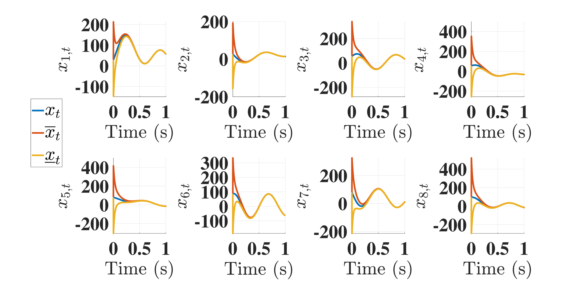 To illustrate Algorithm 1 in handling high-dimensional systems compared to existing methods, we randomly choose an observable eighth-dimensional LTI CT system with \( F\in\mathbb{R}^{8\times 8}\) , \( D\in\mathbb{R}^{8\times 2}\) , \( H\in\mathbb{R}^{6\times 8}\) , and \( W\in\mathbb{R}^{6\times 1}\) utilizing the randi command in Matlab. While conventional transformations in [1, 2, 3, 4] may result in less flexibility in selecting the target form or impose significant computational burdens for large-dimensional systems, our approach in Algorithm 1 proves to be very straightforward in this context. Pick \( (A,B)\) as in Proposition 1 or 2 and compute \( T\) . Consider known \( u_t=(1,1,…,1)\in\mathbb{R}^8\) , unknown \( d_t = 0.5(\sin(2t),\cos(t))\) and \( w_t = 0.3\sin(t)\) with some known bounds, and simulate observer (6). Estimation results are shown in Figure 1.